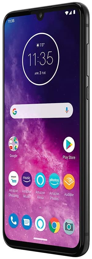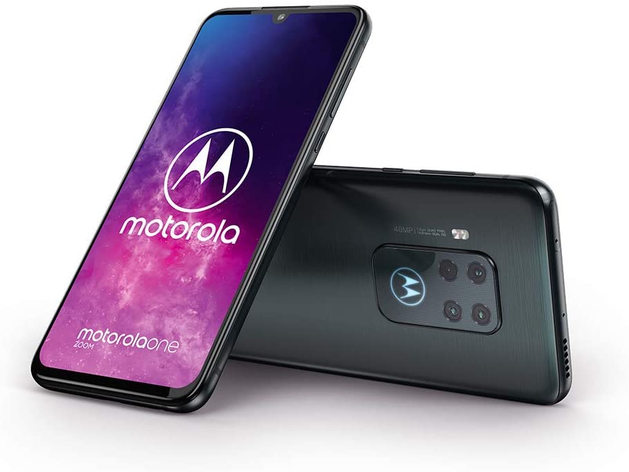 motorola one zoom avec smartphone mains libres Alexa (écran FHD + 6,4 pouces, système à quatre caméras; 128 Go / 4 Go, Android 9 Pie, smartphone double SIM) gris métallique + casque + housse de protection